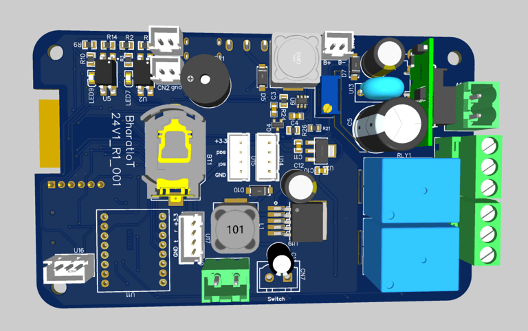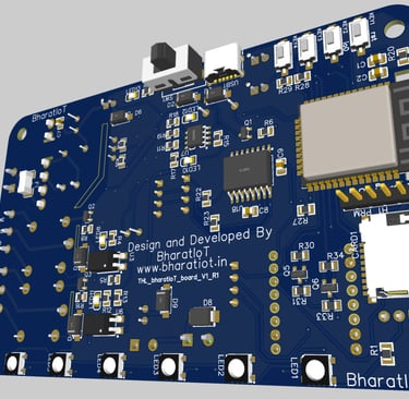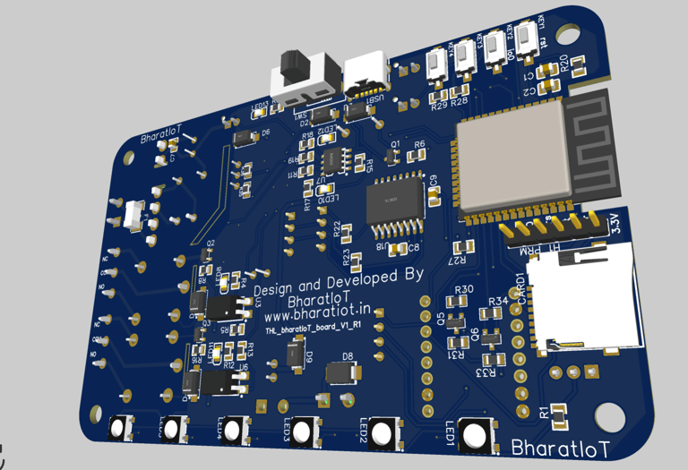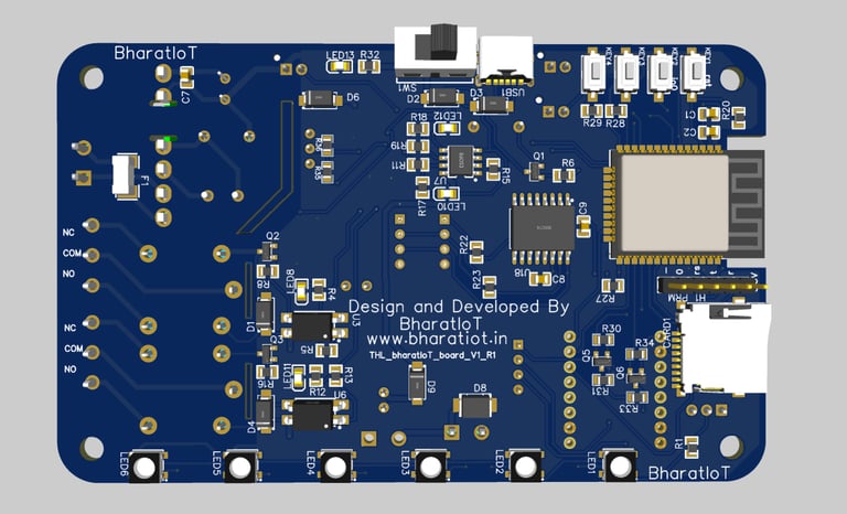 The THL_bharatIoT_board_V1_R1 is a highly versatile and robust IoT board designed to accommodate a variety of applications across sensor integration, home automation, industrial control, educational projects, and data logging. Central to its design is the powerful ESP32 WROOM-32, a main controller celebrated for its dual-core processing capabilities and integrated WiFi and Bluetooth functionalities.